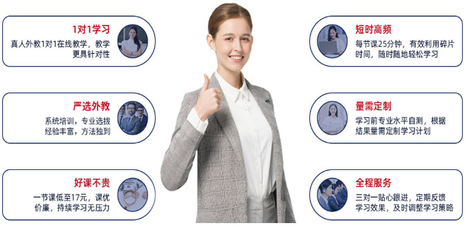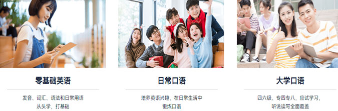 | 出国考试英语 | 在线实时交流互动,全程用英语交流,学习针对性较强,学习问题能够及时得到解答,学习效率较高。话题富有时代感,与学员的出国工作生活都密切相关。 | 根据授课学员水平,量身打造教学方案,通过外教授课,全方位轻松迅速提升学员的英语听说能力 |